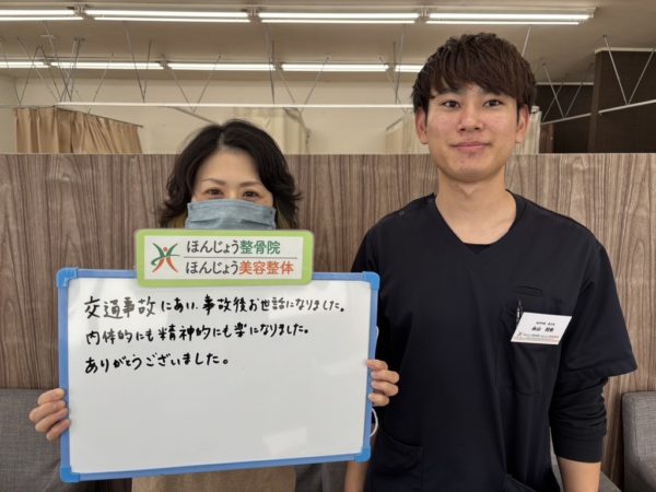 交通事故に遭われた方は精神的、身体的にも辛い症状を抱えていらっしゃるでしょう。ほんじょう整骨院 美容整体ではお一人おひとりにあった治療計画の提案と、どう良くなっていくか分かりやすくご説明します。